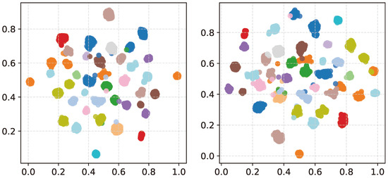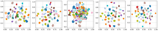 Figure 8 further illustrates the two-dimensional cluster embeddings of the LibriSpeech-clean subset. The dimensions of the cluster embeddings were mapped to a two-dimensional space using the T-SNE. The embeddings of DINO are not clusterable. Furthermore, CEL and SimSiamReg provided more clusterable embeddings containing cluster overlaps and noises. Compared to CEL and SimSiamReg, C-SimSiam generated better and cleaner embeddings while having noises in the clusters. Finally, the proposed method contained less noise and tighter cluster regions.