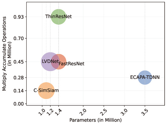Figure 7 exhibits the number of parameters (in the x-axis) and the number of MAC operations (in the y-axis). The MAC operations for the DNN are reported for 1.8 s of audio data. Each circle represents the different DNNs presented in Table 4. The region covered by the circles indicates the performance of the model. C-SimSiam consumes the least memory, having only 1.1 million parameters and 0.14 million MAC operations. Both ThinResNet and FastResNet have 1.4 million parameters. However, FastResNet performs 0.45 million MAC operations, while ThinResNet computes 0.93 million MAC operations. ECPA-TDNN is the most memory-consuming DNN, having 3.5 million parameters and requiring 0.28 million MAC operations. Compared to the existing DNNs the proposed DNN architecture requires 1.2 million parameters. Moreover, it requires 0.45 million MAC operations.