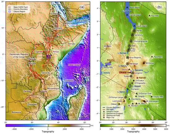 (a) The East African Rift System (EARS) with continental surface expressions indicated in red. The Kenya Rift System is the part of the EARS that crosses Kenya. (b) Volcanoes and geothermal fields along the Kenya Rift System. The figure is re-used without modification and with permission from Fadel et al. [5] following the https://creativecommons.org/licenses/by-nc-nd/3.0/us/ CC BY-NC-ND 3.0 license (accessed on 15 March 2024).
