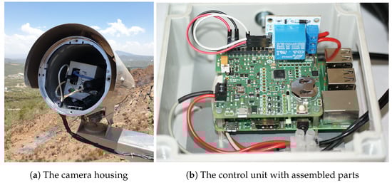 (a) The opened camera housing in the field and (b) the opened control unit.