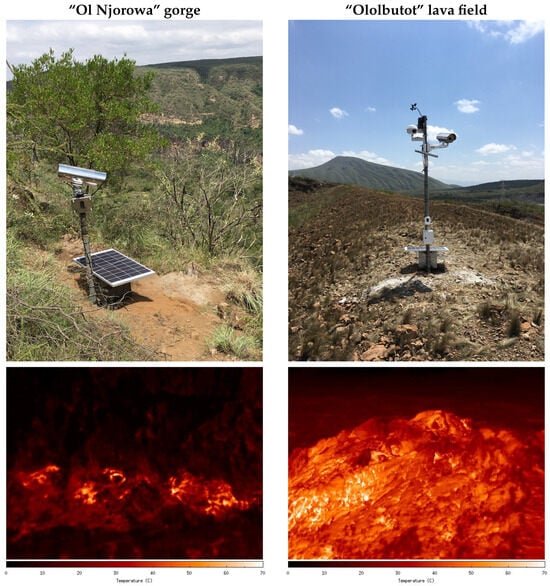 The two observation towers deployed in Olkaria, with a photo of the hardware deployed in the field (top) and the thermal IR image recorded by the camera (bottom). On the left is the installation at the “Ol Njorowa” gorge, consisting of a thermal camera only. On the right is the installation at the “Ololbutot” lava field, consisting of a thermal camera, a timelapse camera, and a meteostation.
