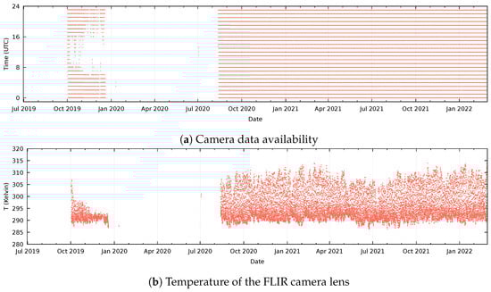 Figure 5 shows data availability and camera parameters recorded at the “Ololbutot” lava field. After the installation, the camera recorded hourly data until March 2020. When the enclosure was opened during maintenance in July 2020, it was found that some power cables within the enclosure had come loose. The cause for this unforeseen damage has not been found. After replacing damaged cables and the control unit, the system functioned until the end of December and resumed working again in February 2021 after replacing a failed battery. The temperature recorded by a sensor at the camera lens varies between 288 and 305 (Figure 5b). A difference with the camera at the gorge is that the upper temperature is on average ±10 lower, and there seems to be a seasonal variation.