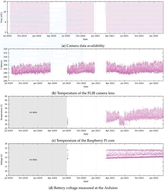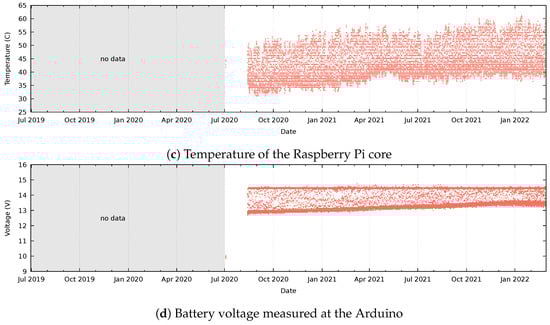 The readings in the control unit started after updating the control unit in July 2020. The temperature readings of the Raspberry Pi (Figure 4c) match the fluctuations of the camera temperature precisely (Figure 4b). There is however a difference in accuracy, as the Raspberry Pi reading shows a gradual increase over time that is not reflected in the camera temperature. The battery status (Figure 4d) shows that the lower (night) voltage level increased over time, reflecting an improvement in the battery condition, until it seems to stabilize in January 2022.