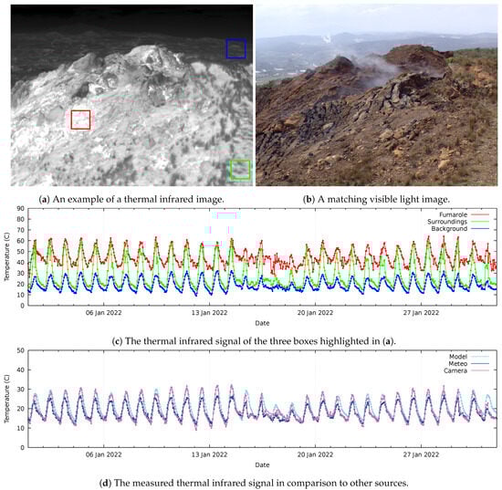 Figure 6 illustrates the data acquired by the camera at the “Ololbutot” lava field. Figure 6a shows an example of a recorded thermal infrared image, while Figure 6b shows a corresponding image of the time-lapse camera. This geothermal surface manifestation is characterized by a fumarole that vents hot gases and steam through multiple cracks in the ground surface, which can be seen in Figure 6b. The red box in the thermal infrared image in Figure 6a reveals in bright tones that the soil surrounding these cracks is relatively warm. The area in the background, indicated by the blue box, is not part of the lava field and appears cooler with darker tones in the thermal image. The soil with patches of vegetation, indicated by the green box to the right of the fumarole and in the foreground, is cooler than the fumarole itself.