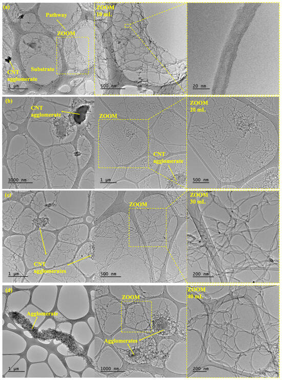 TEM images of the CNTs after 30 min of sonication in (a) 10 mL, (b) 20 mL, (c) 30 mL, and (d) 40 mL batch volumes of PVDF-HFP dissolved in DMF.