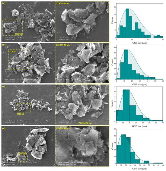 Figure 3 shows SEM images of the GNP batches. Here, a reduction in the GNP dimensions occurs as the batch volume decreases since the sonication is more effective, and more damage is induced on the nano reinforcements. It is possible to measure the lateral size of the nanoparticles due to their geometry, and a Weibull distribution is found when analyzing the measurements taken []. A decrease in the lateral size of the GNP as the batch volume decreases is observed, going from a mean value of 7 µm for the 10 mL condition to a mean value of 15 µm for the 40 mL condition. This has been previously reported by other researchers with sonication time instead of volume of the batch, but similar results can be found where more severe sonication can lead to the fracture or exfoliation of the GNPs [,,,].