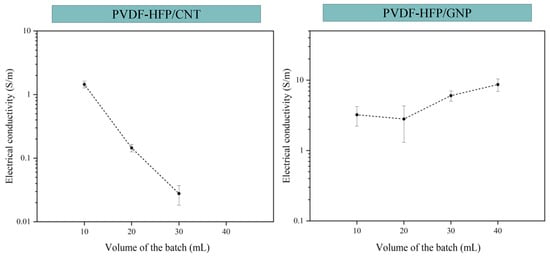 First, it is observed that the electrical conductivity of the CNT-based nanocomposites decreases with the increase in the batch volume, where a 40 mL batch volume does not possess electrical conductivity. This may be related to the effectiveness of the sonication process, which decreases as the batch volume increases, as commented before. This leads to a more entangled network at higher volumes, which promotes a reduction in electrical conductivity since the electrical pathway generated is not efficient.