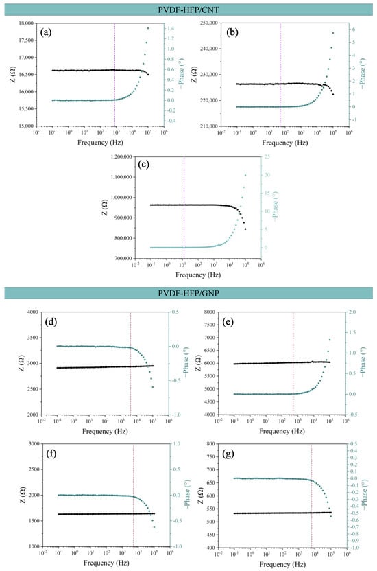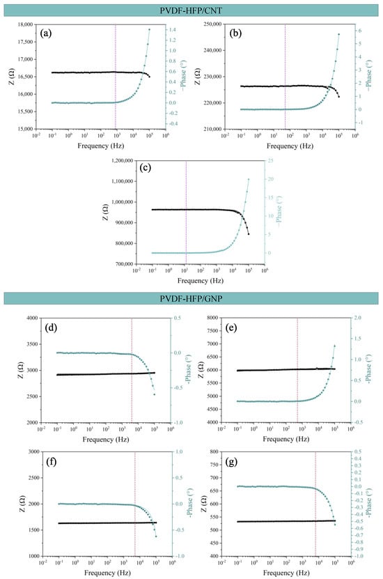 Bode plots for all conditions manufactured: (a–c) the CNT-based composites and (d–g) the GNP-based composites.