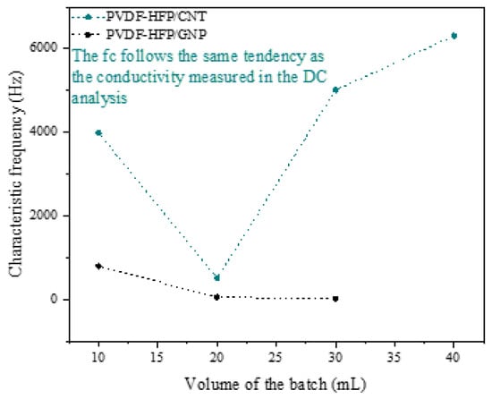 At low frequencies, the more prevalent mechanisms are found by contact and tunneling effects between adjacent nanoparticles. Once a certain frequency is reached, called the characteristic frequency, the current starts to flow through the polymeric matrix in those zones where nanoparticles are further away, and a frequency-dependent behavior can be observed [,,,].