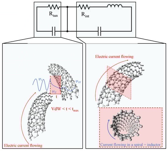 The RCL part models the behavior of a single particle or an accumulation of particles when these are at a distance equal to the VdW distance (agglomerates), where the resistance is the intrinsic resistance of the CNT or GNP. The capacitance and inductance elements show the dissipation of energy, whether in the form of accumulation or in terms of a magnetic field generated when the electrons flow following the CNT cylindric surface.
