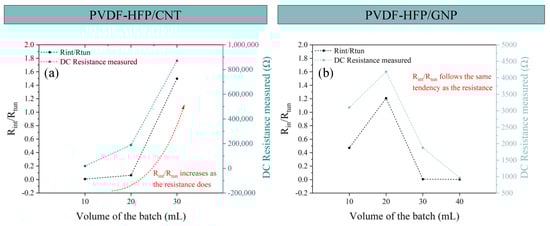 For PVDF-HFP/CNT nanocomposites (Figure 9a), as the volume of the batch increases, the value of the two resistances also increases. For the CNT/30 sample, the value of the Rint is higher than the Rtun, demonstrating that for that volume, the ultrasonication is not effective enough to promote the agglomerate breakage and CNT dispersion, so lower conductivity values are reached. This can be confirmed by the comparison of the Rint/Rtun ratio with the electrical resistance measured in the DC analysis, where both parameters follow the same tendency.