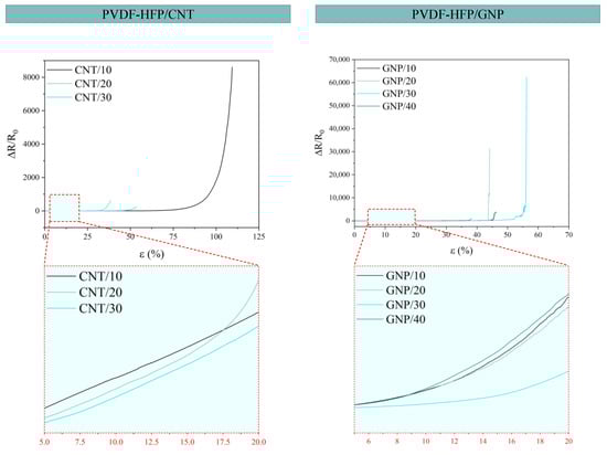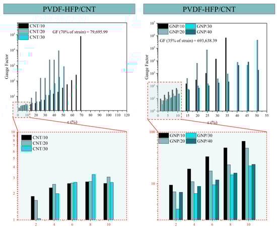 Figure 11 summarizes the GF values as a function of the strain level. The biggest GF of all sensors was achieved with the PVDF-HFP/GNP sensors, having a value of 69.36 × 104 at 35% of strain (GNP/20), while the highest GF achieved with a PVDF-HFP/CNT sensor was 79.70 × 103 at 70% of strain (CNT/10). The higher sensitivity in the GNP sensors is explained through the 2D nature of the nanoplatelets. It is reflected in a higher tunneling area and, thus, a higher allowable separation between neighboring nanoparticles, leading to a more prevalent exponential effect of the tunneling resistance.