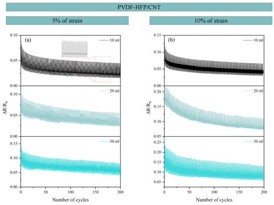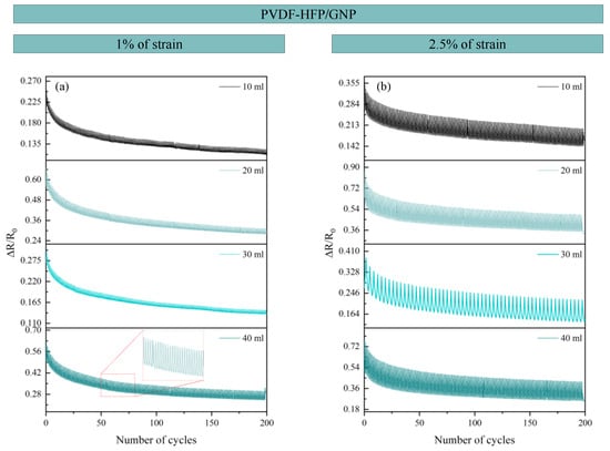 Figure 12 and Figure 13 show the cyclic tests conducted in both types of sensors, CNT- and GNP-based, respectively. For the PVDF-HFP/CNT sensors, 5% and 10% of strain were reached, while the PVDF-HFP/GNP sensors were evaluated up to 1% and 2.5% of strain due to their lower elongation at break. Both types of cyclic tests showed great repeatability of the electrical signal, with no significant changes in the electrical response between consecutive cycles. A slight decrease in the baseline values was observed throughout the cyclic test. This is explained by the inherent viscoelastic behavior of the matrix and the presence of possible irreversible effects in the electrical network, which are more pronounced in the first stages [,]. The electrical pathway formed by the nanoparticles is unstable and needs to settle down after the first cycles to form a more stable path. Regardless of this, the robustness of the sensors is proven, demonstrating the applicability of the proposed materials for sensing purposes.