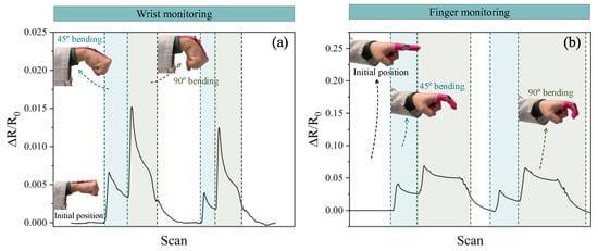More specifically, wrist and single-finger movements were monitored. During both the wrist (Figure 14a) and finger movement (Figure 14b), an increase in ΔR/R0 was measured when increasing the bending angle. A continuous drop in the electrical resistance was recorded when the bending was maintained due to the viscoelastic response of the sensors. This was also observed, but in a less significant way, when monitoring the finger. This can be due to the more severe deformation under the wrist movement. Both bending monitorings were successfully achieved with a similar electrical response in consecutive repetitions, so their applicability for joint motion monitoring was proved.