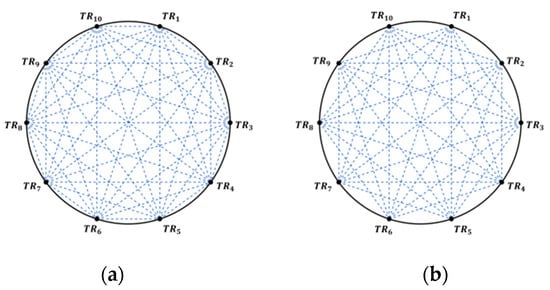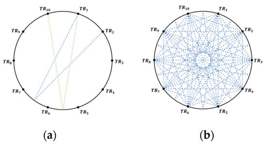 However, the velocity field tends to be nonuniform, so the multiple paths reconstruction scheme in the temperature field is introduced into the velocity field, and Figure 1a shows the schematic of multipath theoretical reconstruction of the velocity field in a circular area. Multiple acoustic transducers (here ) are arranged uniformly around the area of the velocity field to be reconstructed, thus forming multiple acoustic paths through the area to be measured. Theoretically, when one transducer emits a signal, all other transducers are able to receive the corresponding acoustic signal, producing a total of 45 acoustic paths. However, because acoustic transducers have highly directional emission characteristics, with emission angles typically ranging from , not all of the ideal paths are usable in practice. Figure 1b shows the actual reconstruction schematic after taking into account the emission angle of the acoustic transducers, with 10 transducers generating a total of 35 usable paths.