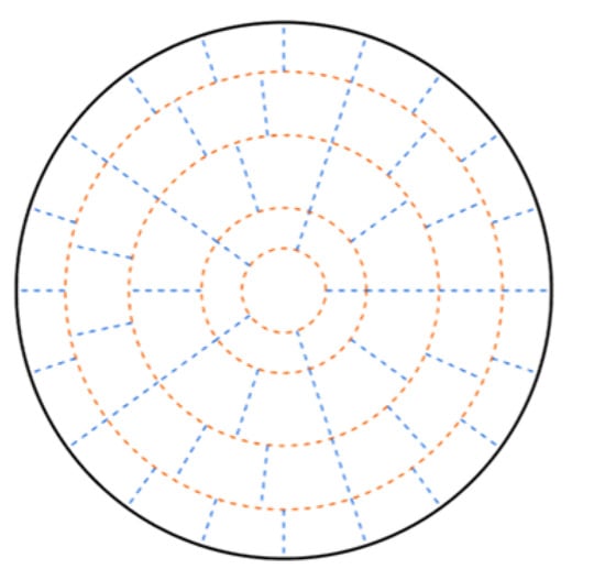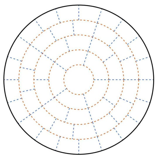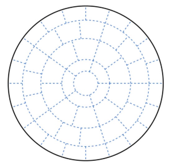 In the above division manner, the circular area is divided into annular sectors and one circle with the center of the circular area as the center and a radius of . The specific division is shown in Figure 2.