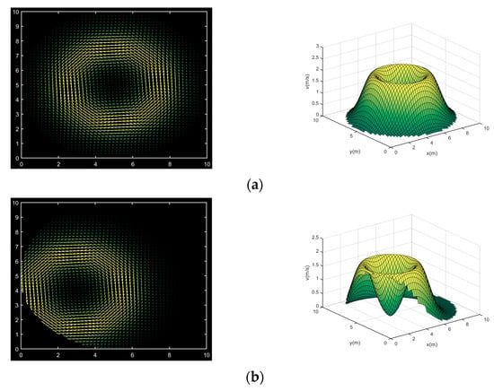 In (16), is the relative amplitude of the solenoidal velocity component, and are the center and radius of the vortex, respectively. is the standard deviation of the velocity field. is the angle between the direction of the velocity and the positive direction of the x-axis. In order to visualize the above four model velocity fields, their velocity distributions are plotted separately, as shown in Figure 5.