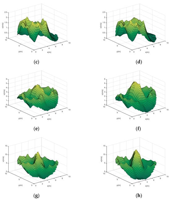 Reconstruction results of model velocity fields under the influence of medium level of noise before and after optimization. (a) Velocity field 1 before optimization; (b) velocity field 1 after optimization; (c) velocity field 2 before optimization; (d) velocity field 2 after optimization. (e) velocity field 3 before optimization; (f) velocity field 3 after optimization; (g) velocity field 4 before optimization; (h) velocity field 4 after optimization.
