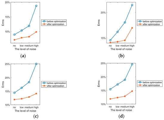 For the medium noise level, after optimization, the average error of the four fields is reduced by 4.6678%; at this time, the of the velocity fields 2, 3, and 4 for reconstruction before optimization have exceeded 18%, which makes it difficult to accurately restore the original velocity field, but it still has good stability after optimization.