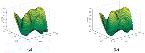 Comparing Figure 10 with Figure 6, we can obtain that the two vortex locations of the original simulation field are (0.53, 0.31) and (0.39, 0.52), the coordinates of the reconstructed vortex before optimization are (0.56, 0.28) and (0.30, 0.45), and the coordinates of the reconstructed vortex after optimization are (0.54, 0.30) and (0.39, 0.46). By comparison, after optimization, the reconstructed velocity distribution is more accurate and better reconstructed.