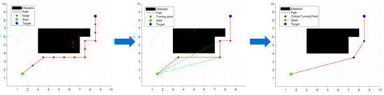 Step 2: Remove redundant turning points. After the path is optimized by step 1, the redundant nodes are removed, and then the new path is optimized in the next step to remove redundant turning points. Let the new path nodes set be . First, connect node to , , …, in turn to determine whether the straight line crosses the obstacle or not. If the straight line is the line that crosses the obstacle for the first time, then is the critical turning point, and the nodes between node and node are the redundant turning points, then the redundant turning points are removed and the set of path nodes is updated. Then, connect the node to the following nodes in turn, and repeat the above determination step until it is connected to the target point .