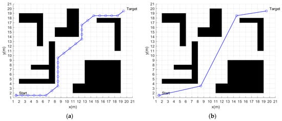 The planned path of the traditional A* algorithm is shown in Figure 5a, where the blue circles are the path nodes and the blue line is the path. The time spent on path planning is 0.076 . The path length is 30.73 . There are 28 path nodes and seven turning points in the path.