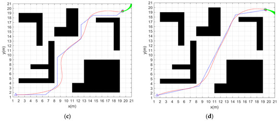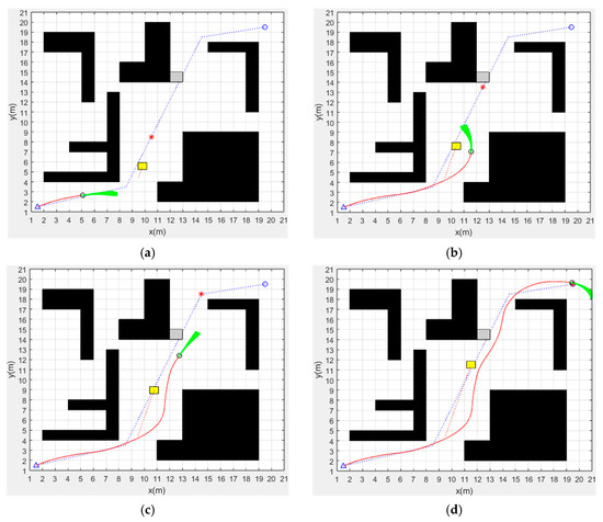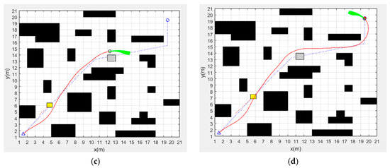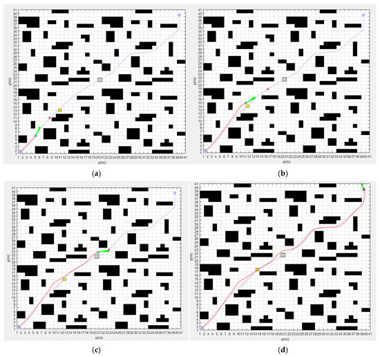 The path-planning effect of the fusion algorithm in map 1 is shown in Figure 8. Figure 8a shows that the fusion algorithm starts path planning along the global optimal path. Figure 8b shows that the AGV detects moving obstacle and starts local path planning to successfully avoid moving obstacles and then continues to follow the global optimal path. Figure 8c shows that the AGV detects an unknown static obstacle and starts local path planning to successfully avoid it and then continues to follow the global optimal path. Figure 8d shows that the AGV successfully reached the target point. It can be seen from the figure that the fusion algorithm can successfully avoid dynamic obstacles and unknown static obstacles in the process of following the global optimal path. The simulation results show that the path-planning time of the fusion algorithm in map 1 is 58.76 and the path length is 29.30 .