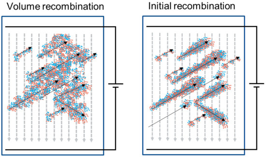 Comparison of the phenomenon of volume (left) and initial (right) recombination of ions in gas. The arrows represent the particle tracks. Initial recombination of ions occurs only between ions separated by the interaction of the same incident particle and does not depend on the number of particles incident on the detector (the clouds of ions formed as a result of the interaction of different incident particles do not overlap). Volumetric recombination also occurs between ions separated by the interaction of different particles and depends on the number of particles incident on the detector. The intensity of recombination occurrence, depending on its type, can be modified by the gas type and pressure inside the detector and the intensity of the electric field.