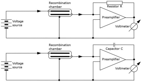 The realization of the measurement of the ionization current of the recombination chamber using an electrometer of the Keithley 6517B type [2] is possible based on two modes of operation of the device: current and charge (integrator) systems [23]. A DC amplifier, often an operational amplifier, is used to realize the input stage of the measuring system regardless of the mode of operation. The difference between the two cases is the use of a resistor or capacitor in the feedback loop of the operational amplifier. In the first case, the measured ionization current is proportional to the voltage at the output of the amplifier with a proportionality factor of the inverse of the value of the feedback loop resistor R. The time constant telling the stabilization of the system depends on the resistance R and the input capacitance of the system .
