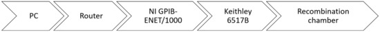 Diagram of the measurement system based on a recombination chamber and a Keithley 6517B type electrometer.