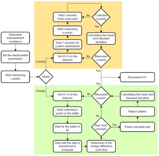 A flowchart of the existing (orange) and the new (green) measurement algorithms. The approximate measurement times for a current of about 100 pA (approximate calibration conditions of the REM-2 type detector in the NCBJ laboratory ) are for existing and new algorithms and are 220 s and 10 s, respectively. The existing measurement algorithm is based on the electrometer current mode and data acquisition by fetch command. The new algorithm uses a charge mode and data acquisition collected in an internal buffer using the trac:feed:cont next command.