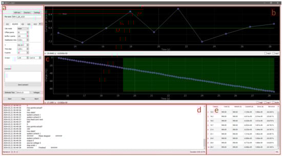The software was developed in the Python3 language using libraries including pyvisa, multiprocessing, PyQt5, h5py and numerical processing NumPy. Figure 5 shows a view of the software GUI. The window is divided into five areas: (a) the area for setting the measurement mode, session parameters and measurement control; (b) the overall graph of the entire measurement; (c) the sub-graph for one measurement execution; (d) the communication flow window and (e) the measurement results window.