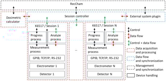 The K6517 and RecCham v. 22.08 software provide a number of opportunities to explore new measurement algorithms, create new dosimetry systems and, thanks to their versatility, support the activities of other laboratories. Figure 6 shows a block diagram of the RecCham measurement system. It can be seen that the K6517 program is nested within the RecCham system as a single session that handles the measurement process of the Keithley 6517A/B device. A diagram of the communication between the processes and the tasks performed by the different components of the system is shown. An external system plug-in is also presented, which must be compatible in terms of the communication protocol and control and the measurement data format.