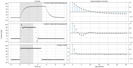 When the system is operating in the current mode with the damping turned off, the waveform has an oscillatory character for a sudden change in the measured value. In addition, the waveform shows an overshoot when the measurement conditions change. The autocorrelation plots confirm the observation of the oscillatory nature of reaching the target value for the system operating in current mode with the damping off. The system operating in charge mode is significantly faster, and the speed of the system’s response time cannot be determined from the presented graphs due to the limitation associated with the rate of change of measurement conditions.
