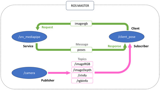 A client node (named client_pose) is subscribed to the mentioned topics for obtaining the RGB image and its corresponding depth information each time. The RGB image is then sent as a parameter of a request made to the service node (/srv_mediapipe). Once the request is received, the service node returns a response coded as a “pose” type message that contains a bidimensional array of points (in the coordinate system of the RGB image), corresponding to the pixels where a person’s joints are located according to the landmarks shown in Figure 3.