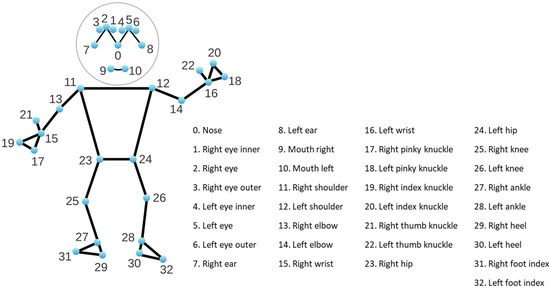 Body poses landmarks obtained when the Pose solution from MediaPipe is used. This graphical representation has been obtained from the MediaPipe website [68].