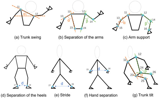- Trunk swing (see Figure 4a): It is measured through the angle of inclination of the shoulders.