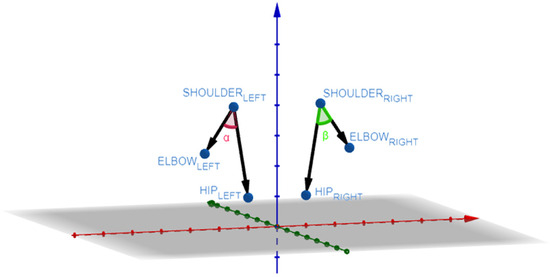 where A, B, and C are the three-dimensional points corresponding to the joints. Figure 5 shows an example for calculating the separation of the arms.
