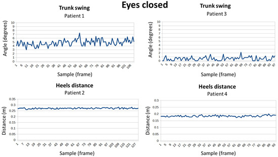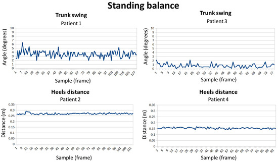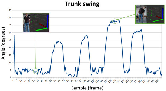 The trunk swing, measured from the angle of the shoulders, is depicted in Figure 6. This is the parameter most associated with balance, and is easily identifiable; the loss of stability immediately causes the trunk to sway and, in the worst case, a fall. In the first capture, a straight position offers values lower than , while in the second capture there is a marked trunk swing with angles greater than (in this case, the pose has been forced for simulating a strong swing of the trunk).