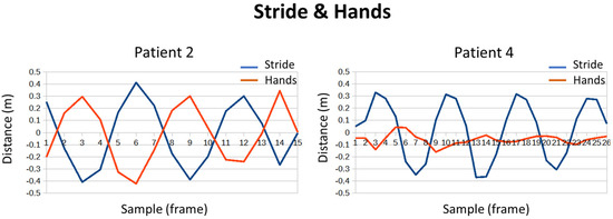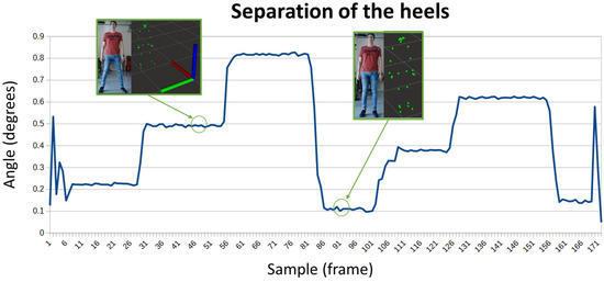 Separating the feet increases stability, consequently, it is a resource used by those people who suffer from balance problems, since they separate their feet further to find a safe position. In Figure 7, the distance between heels has been measured; in the first capture, the feet are separated at half a meter, while in the second, the feet are together ten centimeters apart. In this case, the Y-axis represents meters, and the X-axis represents samples across time.