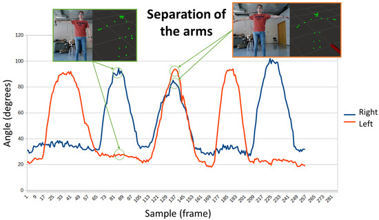 The use of the arms is an innate resource to improve balance. Figure 8 shows the evolution of the angle of the arms, both right and left. In the first capture, the right arm remains up, while the left is down. In the second, both arms are raised, forming an angle of almost with respect to the trunk. In this case, the Y-axis represents angle in degrees, and the X-axis represents samples across time.
