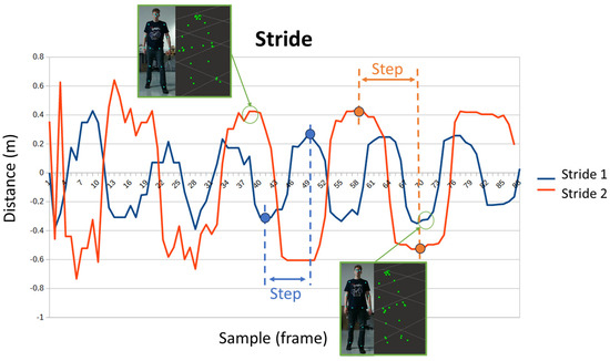 - Stride (see Figure 4e): To measure the amplitude of the steps, the depth difference between the ankle joints is calculated.