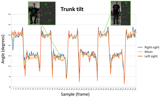 Getting up from a chair and sitting down is not a simple task when there are mobility problems. The number of attempts and successes, as well as whether the person holds on to something to achieve it, is used by various tests to measure the patient’s fragility. The evolution of the angle of the trunk has been represented in Figure 11. This parameter is useful to analyze when the subject stands up or sits in the chair. There are two signs, corresponding to each side of the trunk, and a third signal representing the mean. In the first capture, the subject is seated, and his angles are around . In the second one, the subject has stood up and its trunk forms an angle greater than .