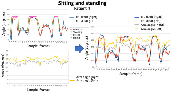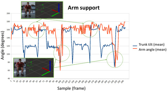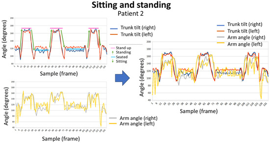 In the previous trunk inclination test, it is also possible to measure whether the user uses his arms to stand up or not. Both situations have been represented in Figure 12. In the upper capture, the patient keeps his arms extended during the transition to standing. In the lower capture, the subject uses his arms to stand up and is thus reflected in the angle of the arms, which are no longer extended and are bent at angles less than .