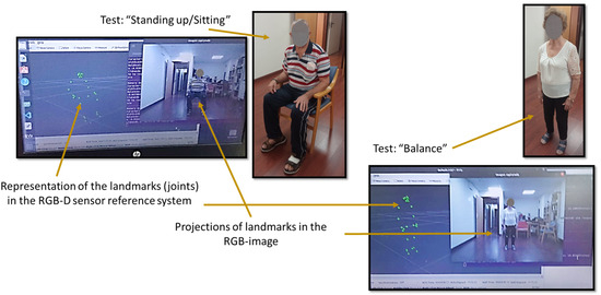 Note that, although the MediaPipe Pose solution is capable of inferring depth from the 2D image, this depth is referenced to the center of the body, and does not allow the reconstruction of the 3D space according to the reference system of the RGB-D sensor. As it is particularly important the computation of the speed and the trajectory of the subject for estimating the score of some items related to gait in most of standard of care tests, values obtained from the MediaPipe Pose solution are transformed to the RGB-D sensor reference frame by applying the corresponding transformation by using Equations (3)–(5).
