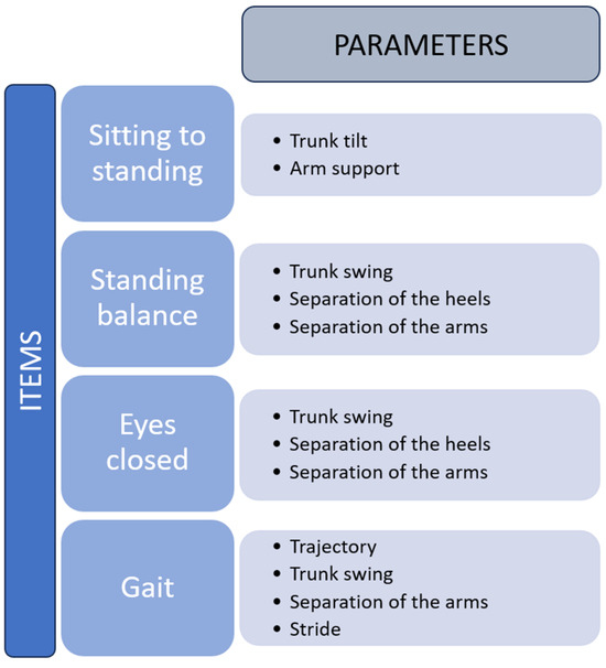 Four exercises were performed, based on different balance and gait scales. In Figure 14, the evaluated items are shown together with the parameters evaluated during their execution.