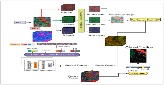 Hyperspectral image classification categorizes pixels or regions within a hyperspectral image into predefined classes or land cover categories. Meanwhile, the supervised machine learning methods support vector machine (SVM) [7] and random forest (RF) [8] have been widely used in the early stages of hyperspectral image analysis using texture and color features of the land covers. These methods rely on spectral signatures to discriminate between different classes of land cover. However, hyperspectral data are characterized by high dimensionality, as each pixel contains many spectral bands. Researchers have thus explored various techniques to address these challenges and enhance classification accuracy. Feature-extraction methods, such as principal component analysis (PCA) [9] and minimum noise fraction (MNF) [10], have been utilized to reduce data dimensionality while preserving relevant information. Additionally, dimensionality reduction algorithms like non-negative matrix factorization (NMF) [11] and t-distributed stochastic neighbor embedding (t-SNE) [12] have been employed to enhance the separability of different classes in reduced feature spaces.