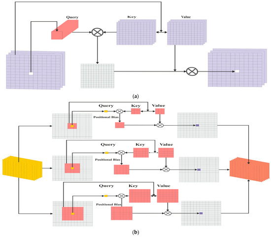 where is the scaling factor. The attention obtained using Equation (4) is repeated for every pixel in the feature map. The detailed architectures designed for the attention module of the classical transformer and the proposed one are shown in Figure 2.