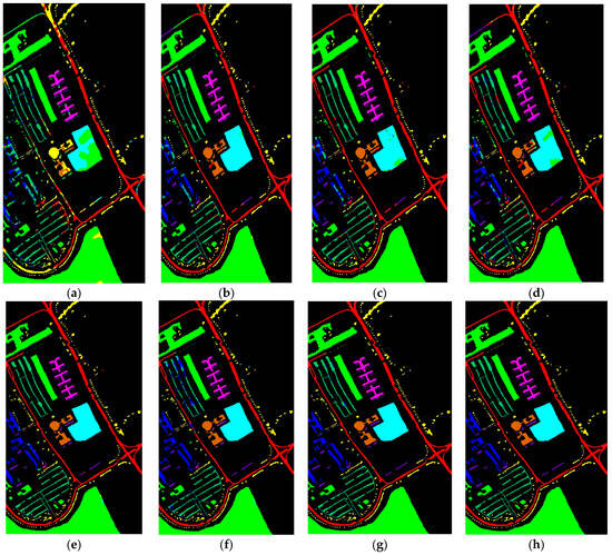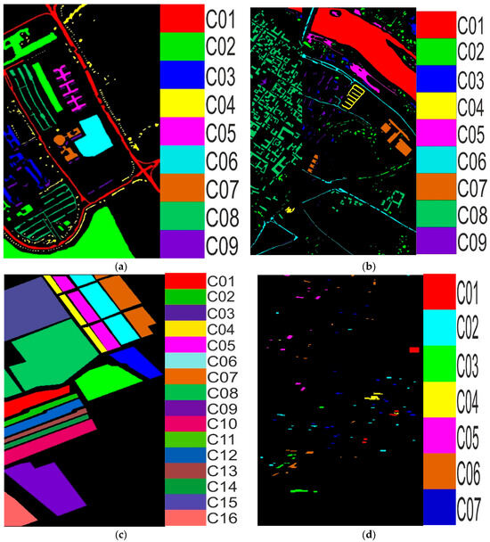 The ground truth map with the class label colors of the PU, PUC, SV, and Houston13 shown in (a), (b), (c), and (d), respectively.