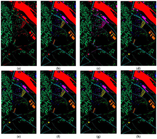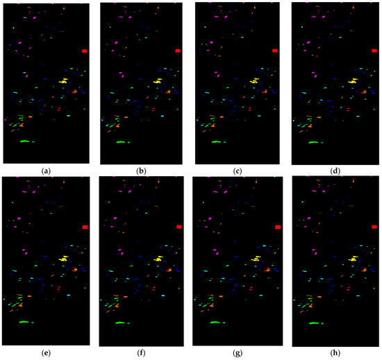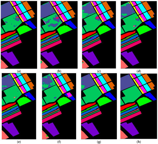 The SV data were captured using the Airborne Visible/Infrared Imaging Spectrometer (AVIRIS) sensor, and they have spatial dimensions of around 512 × 217 pixels. The dataset typically contains 224 contiguous spectral bands. The spectral bands usually cover a range from 0.4 µm to 2.5 µm, and they have 16 land covers. The Houston13 dataset contains both hyperspectral and LiDAR data from an urban area in Houston, Texas, USA. This dataset has 144 spectral bands in the 380 nm to 1050 nm region and has been calibrated to at-sensor spectral radiance units. The spatial dimensions of the dataset are 349 × 1905 pixels, with a spatial resolution of 2.5 m. The detailed description of the datasets is shown in Table 2, and a color map of the land covers is shown in Figure 5.